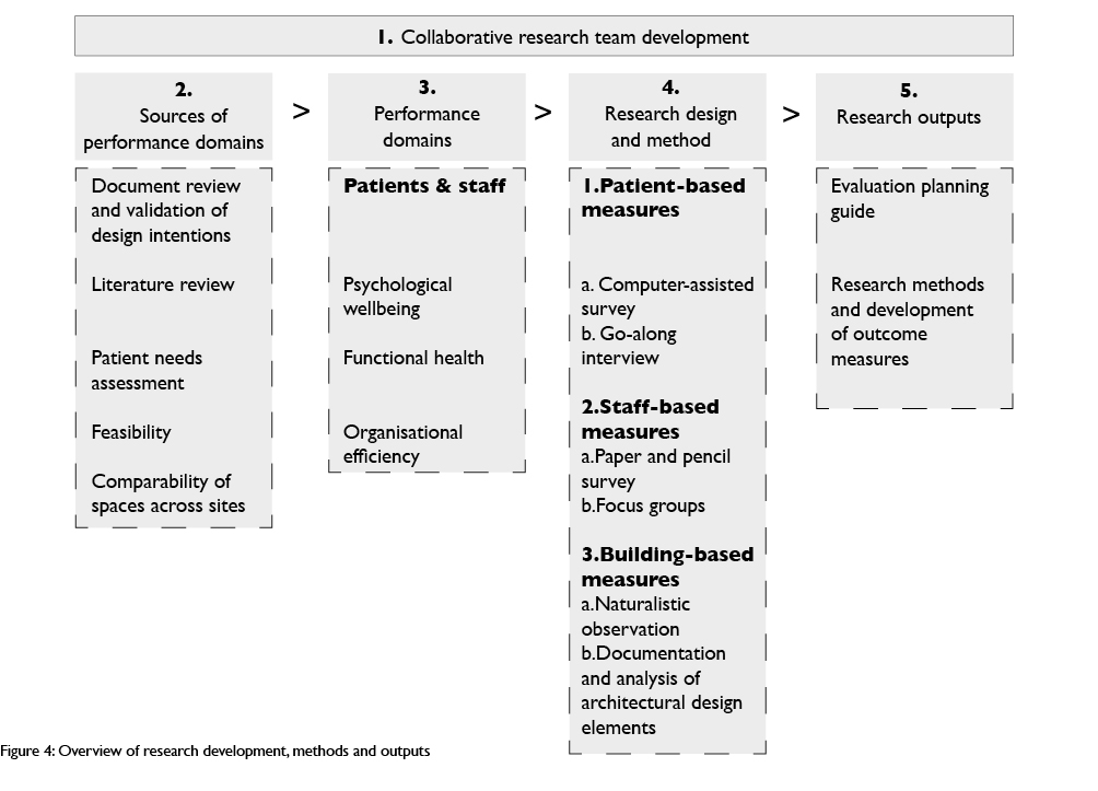A rigorous approach to POE The design intentions of the new hospital informed the theoretical basis for development of methods and measures for the POE. The overarching goal was to select outcomes that could be attributed, directly or indirectly, to the building design with consideration of the factors that might moderate the effect of design on psychosocial and health outcomes. As outlined in Figure 4, our approach to POE can be summarised according to five steps: collaborative research team development, review of sources to establish performance domains, selection of performance domains, development of the research design and methods, and consideration of research outputs. Each component is described below.