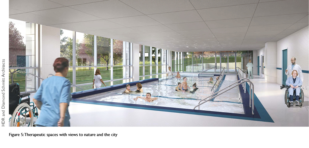 Patient needs assessment: Chronic conditions are affected by several factors including physical health,35 personal characteristics and socio-demographics,4 mental health36 as well as health and social experiences.4,37 These dimensions formed the basis of an extensive patient needs assessment conducted at Bridgepoint Hospital prior to moving to the new facility. An emergent theme in the assessment results was the patients’ perceptions of how the building design (eg access to daylight and views, fresh air, social spaces, wheelchair mobility, wayfinding and privacy) influenced their experience, rehabilitation, and associated health outcomes.6-8