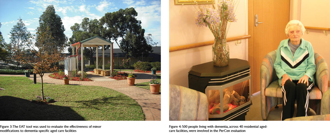 An opportunity to further develop the tool occurred when it was needed for a major research project undertaken by the combined teams from UTS, University of New South Wales (UNSW), University of Wollongong (UW) and Sydney University (USyd). The study, called PerCen, deliberately separated built environmental changes from staff training in Person Centred Care (PCC) to determine the separate effects from these interventions. Psychometric tests were used to determine before and after changes in the quality of life and quality of care. This included 500 people living with dementia in 40 residential aged-care facilities that were randomly assigned to groups of 10, being: care as usual; person-centred changes only; physical changes only; and both changes.