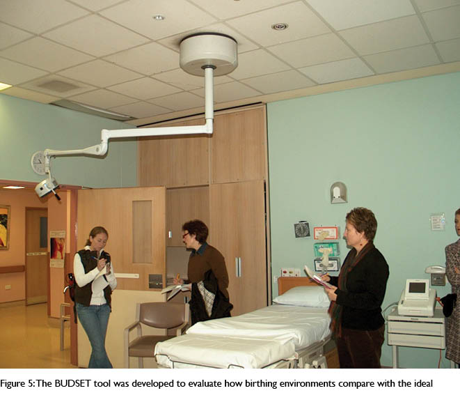 The birthing unit BUDSET tool While the EAT tool was being tested, the researchers in the UTS Centre for Midwifery, Child and Family Health in the Faculty of Health, believed that the work with environments in dementia care would have similar results to those for birthing spaces. Their objective was to establish a birthing environment that was supportive but that was also unconsciously unobtrusive. The cues given to birthing occupants by the configuration of the spaces were either frightening or not comfortable. The objective was to develop a specific evaluation tool that would take the philosophy of ideal birthing spaces into account. This tool would determine whether the hospital birthing units in NSW were currently achieving spatial benchmarks for such facilities, or to see what could achieve them.