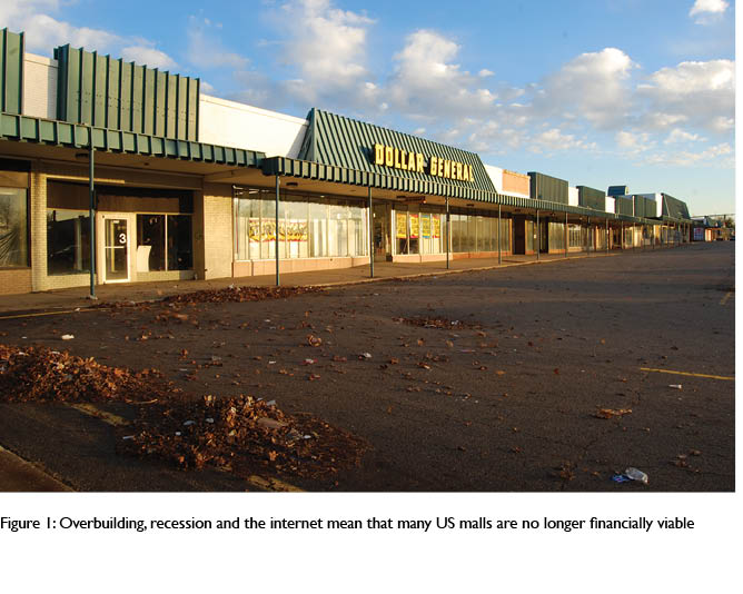 The growth of shopping malls paralleled the rise of suburbia in the 1950s through to the 1970s. Planners then had little regard for fuel economy, the environment or for fostering walkable spaces. This exuberant period of growth in America did not last, however, and many shopping malls around the country are failing or abandoned.3 Of the 2,000 regional shopping malls nationwide in 2001, 19% were considered in danger by the Congress for the New Urbanism and PricewaterhouseCoopers. In many cases, poor economic performance was compounded by site or location characteristics that made a turnaround unlikely as long as a conventional retail mall format was retained. This has created areas known as “greyfields”, largely abandoned or underused spaces that nevertheless offer opportunities for mixed-use areas that combine work, home and other facets.