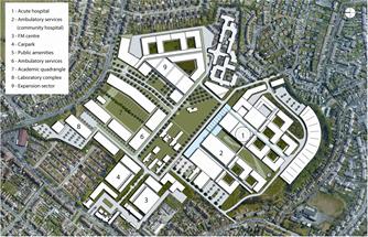 Functional Relationship Diagrams (1:500) Functional areas of the hospital are arranged in block form at each level, and stacked in 3-D, to indicate how required departmental size and key adjacencies can be achieved – in particular Emergency/Imaging, Emergency Assessment, Outpatient/Diagnostics, Community Hospital/Diagnostics, Theatres/ICU, Theatres, Surgical Wards and Day Care. (Exhibit 4)