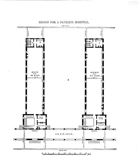 An innovative ward plan, founded on a 30-foot wide unit and housing 30 patients, was derived from the Crimean experience, and came to be known as the ‘Nightingale Ward’ (Figure 3).