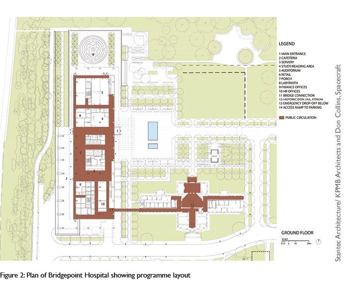 Design intentions for Bridgepoint With an awareness of the evidence on salutogenic design14 and the therapeutic benefits of nature,19,24 the architects sought to “enhance quality of prolonged life”25 and “restore courage and lift spirits” through the “power of good design”.26 The central design intentions were to create an environment of wellness by enhancing the connection to community, nature and the urban environment, providing opportunities for social interaction and inspiring physical activity and health. According to the architects, “the project is as much about city-building and engagement with the community as it is about creating an architecture of wellness”.25