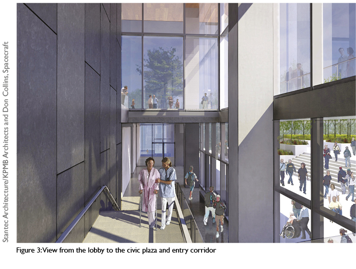 Physical and visual connection: Expansive glazing and passages from both rooms and corridors connect the patients to both the adjacent community and park both visually and physically. Its connection to the adjacent community is balanced with a conscious and constant connection to the park to derive “therapeutic benefits of nature”.25 Examples of these design elements include: • use of glazing configured to draw patients to near and distant views of the lake, city, park and community • main internal corridors and elevators terminate in views, exits and entrances to the exterior • programming at grade encourages community interaction.