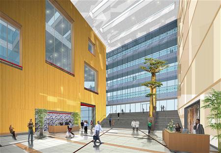 Low-slung, open reception desks are immediately visible from the entrance, with attractive and comfortable seating areas and greenery nearby. The buildings feature generous staff quarters, with rooftop cafes/canteens, lounge areas and expansive views onto the city.