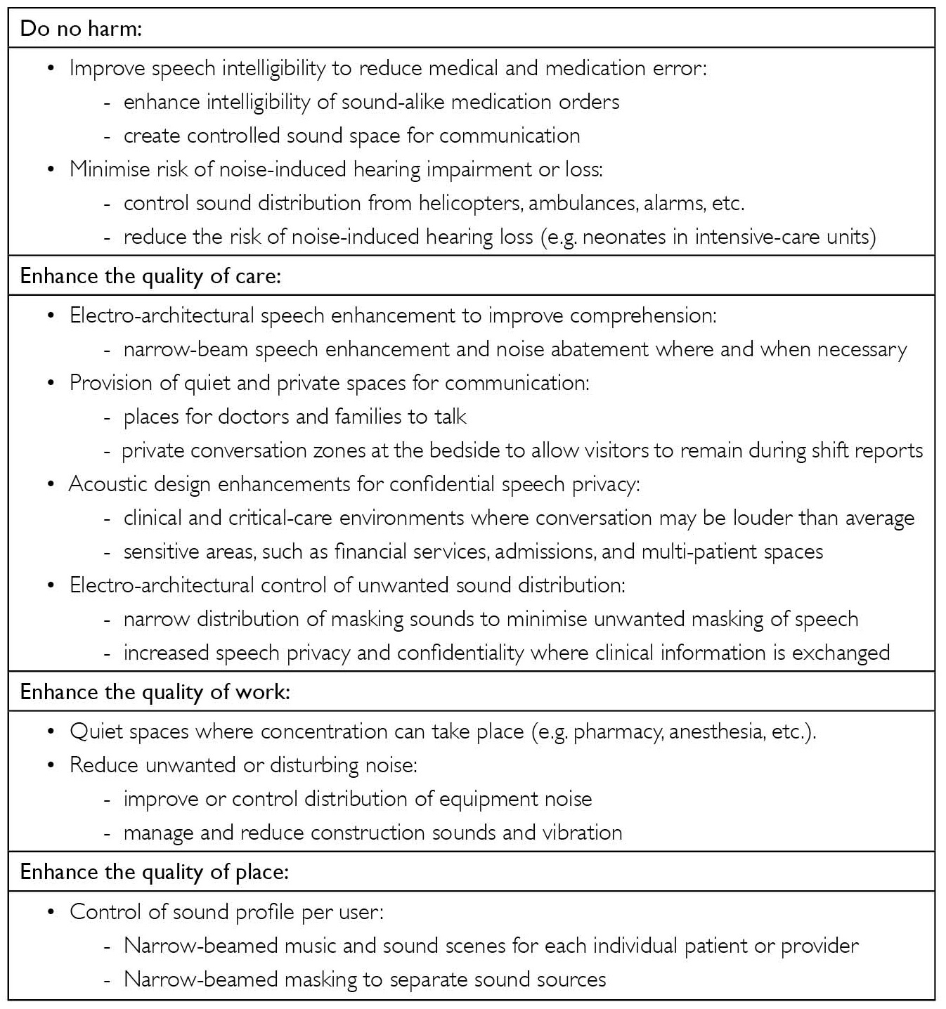 Findings from surveys of 118 medical practitioners and administrators at the California Institute for Telecommunications and Information Technology (Calit2), at the University of California, San Diego, confirmed concerns regarding acoustic conditions in healthcare settings. The list in Table 1 reveals the priorities for improving sound conditions, among those surveyed. Ordered in a ‘hierarchy of care’, acoustic modification should first consider the likelihood that unwanted noise may lead to death, or severe adverse events, such as medical or medication error as a result of miscommunication related to competing or high-level sound. The list of needs also considers enhancement of provider performance and the quality of the care environment, in addition to patient needs.