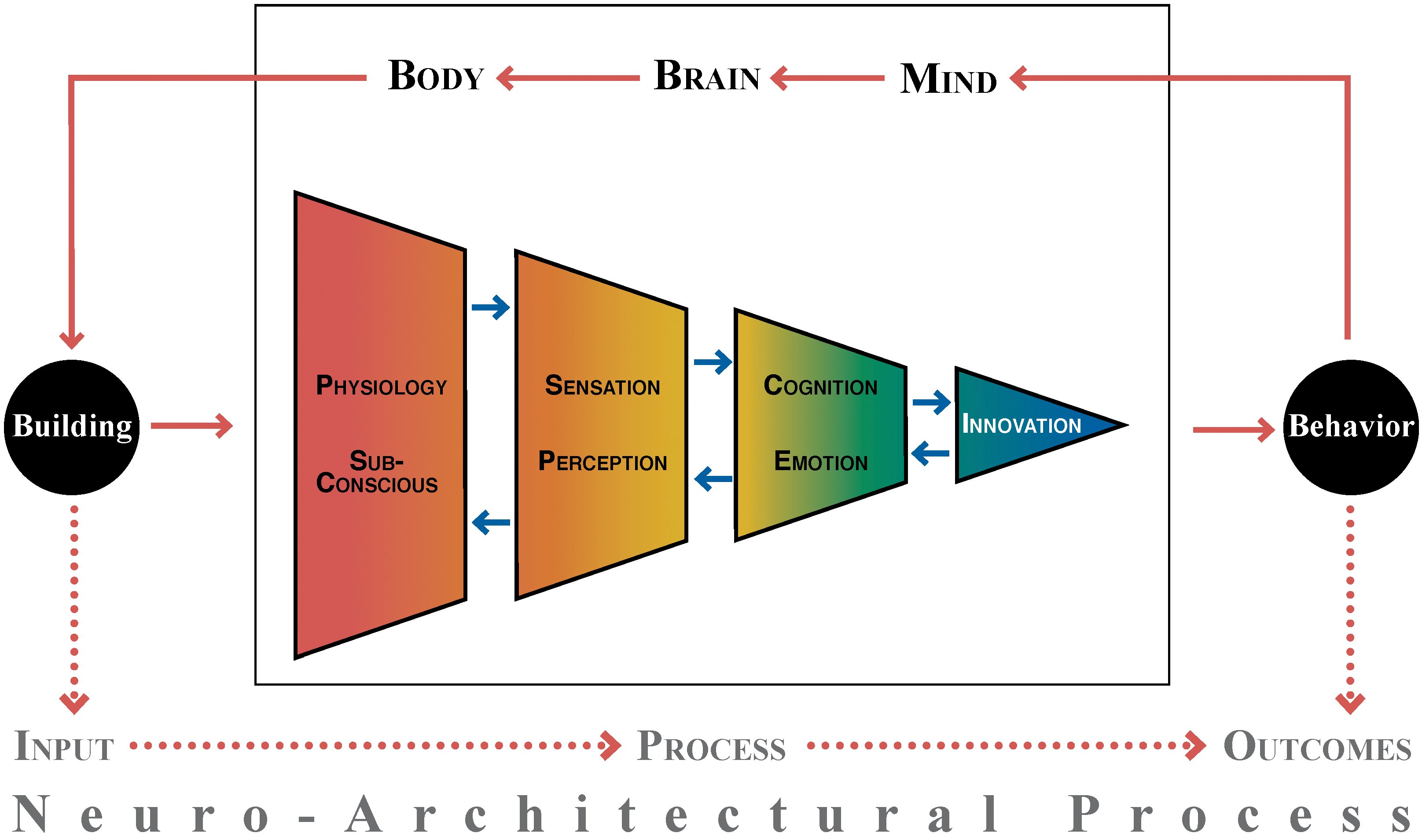 A ‘neuro-architectural’ approach The neuro-architectural process informs design by correlating specific measures of the built environment (input) with quantified measures of the brain’s and body’s responses (neural, physiological and psychological responses), as well as sociological, behavioural and economic outcomes (output). This process gives weight to scientific methods of research, linking input, response and output, and allowing for statistical and critical evaluation of design outcomes.