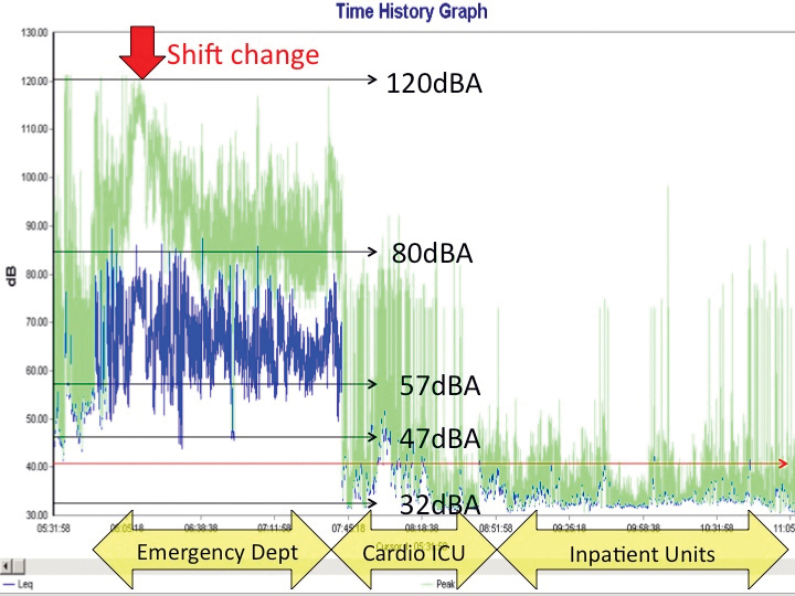 Unfortunately, the majority of critical-care environments far exceed these levels, dramatically increasing intelligibility and associated error. Figure 3 plots sound levels in a variety of hospital conditions. Using standard protocols for evaluating averaged noise levels, the intensity of sound ranged from 75-85dB(A) Leq in critical-care units such as emergency and intensive-care departments. These findings are consistent with recent studies demonstrating that noise in healthcare environments has been steadily increasing over the past 50 years, with no single facility operating within the sound levels recommended by the World Health Organization.7 When impulse-sound peaks are measured, using time constants capable of recording sounds from alarms and equipment, a near constant impulse level is seen (in green lines), ranging from 100 to 120dB peak during shift changes.
