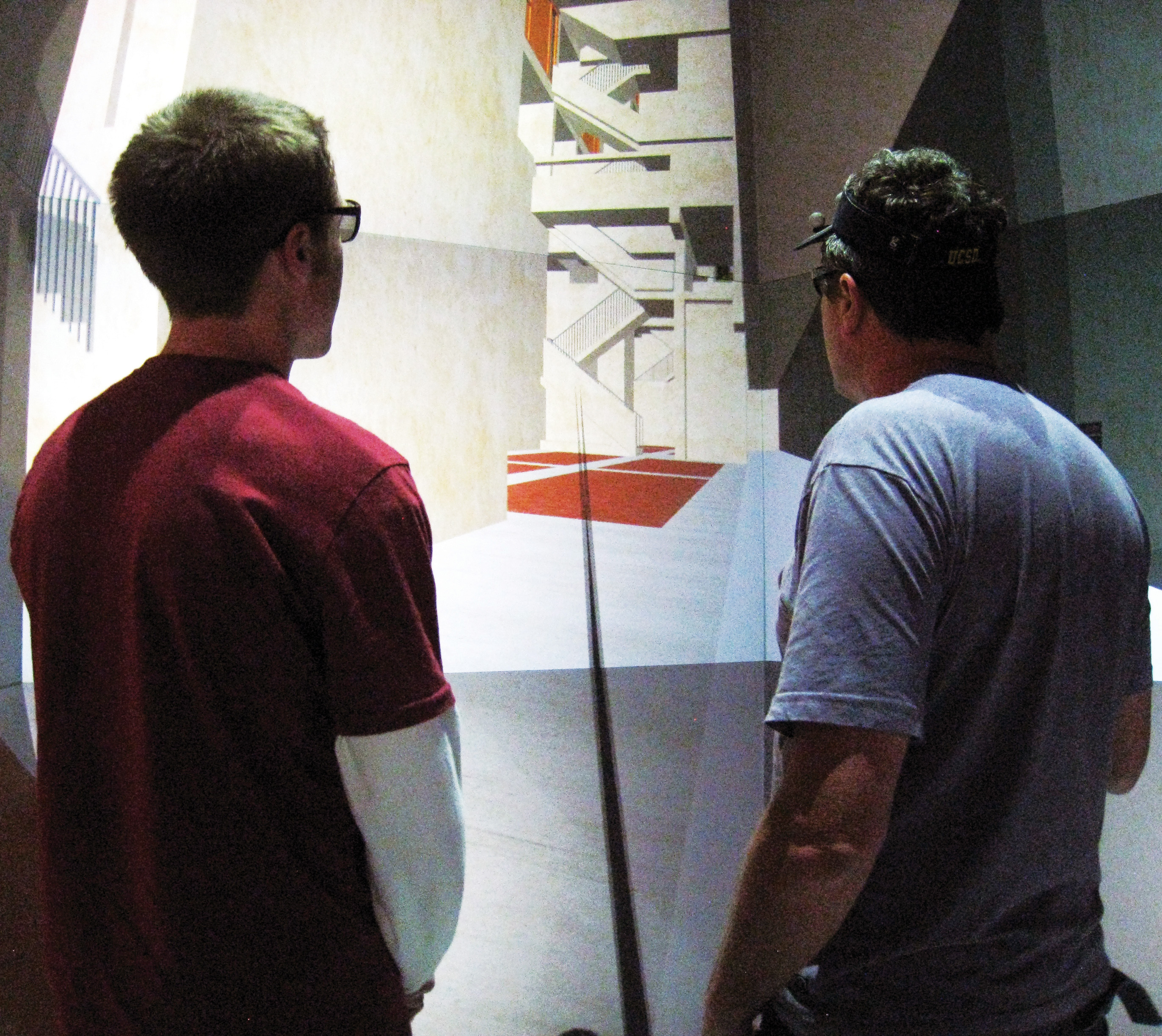 | Figure 6: Dr Edelstein navigates through the virtual-reality stereoscopic model of the Calit2 Atkinson Hall in the StarCAVE |