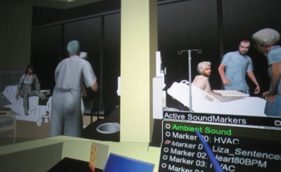 Sound design An acoustic simulation was designed to model the consequences of noise conditions on work errors. The Center for Quality Improvement and Patient Safety report, and analysis of 26,000 records in a US-wide anonymous error-reporting system (MEDMARX), revealed an increased rate of error in medications with similar-sounding names.5 The consequences of this issue were demonstrated at a workshop where speech intelligibility and error were presented in three conditions: a dedicated sound lab, an auditorium, and in CAVE virtual simulations.