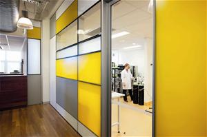 The research laboratories sit within a two-storey ‘light box’ above the original heritage façade. The ‘box’ is clad with translucent glass planks, ensuring diffuse daylight to the laboratories throughout the day and very low energy consumption. To maintain sun penetration to neighbouring houses, the building had to be stepped toward the north. This enabled the new glass box to ‘slide’ over the older building, creating a large-scale composition with smaller scale detailed elements at the conjunction of the forms.