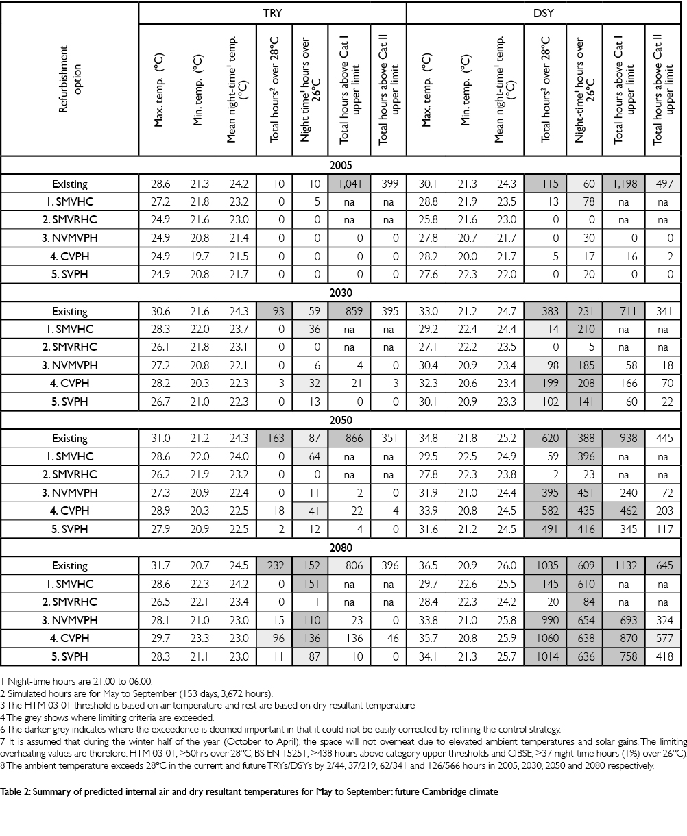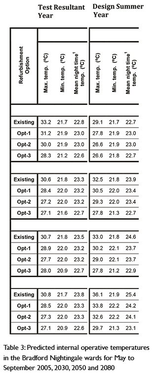 Internal temperatures were predicted for current and future typical and extreme temperature years as represented by TRYs and DSYs for current and future conditions, developed for Bradford by the University of Exeter using the customary CIBSE methods, as for the Addenbrooke’s exercise. Simulations were undertaken with all eight weather years for 2010, 2030, 2050 and 2080. Predictions of the likely air and operative temperatures were compared with the CIBSE, HTM 03-01 and BS EN 15251 overheating criteria (Table 3) as appropriate. The results clearly indicate that neither the existing or refurbished building will overheat in typical years, as judged by the HTM 03-01 and BS EN 15251 criteria. However, in the 2050s warmer night-time temperatures may be experienced (although these might be ameliorated easily with a refined window-opening regimen if the windows are openable to a useful degree in sufficient numbers). In the extreme temperature years (ie the DSYs), however, HTM 03-01 shows overheating will occur in the existing building and in refurbishment Option 1 as early as the 2030s. Options 2 and 3 are resilient.