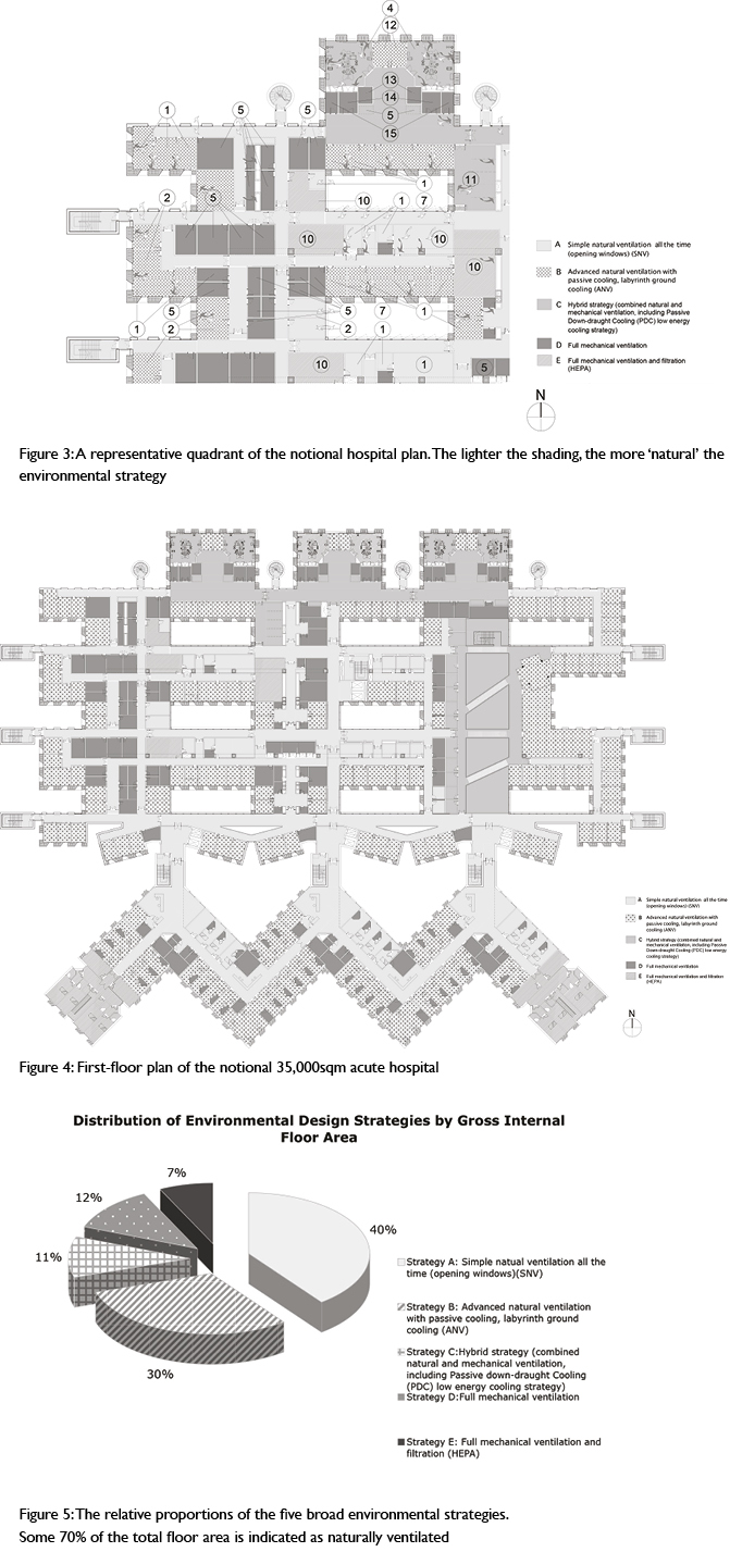 The current tendency to devise deep hospital plans, tessellating clinical departments, has been developed over perhaps 40–50 years. Deep plans are mechanically conditioned using strategies originally designed to maintain comfortable internal conditions artificially in fierce continental climates. One might question their appropriateness in a more temperate climate, especially one that might be warming. A recent hospital in London lauded for its excellent medical planning is 50 rooms deep between one window wall and the next at ground and first floor levels. However, our work suggests that a significant proportion of hospital spaces might be naturally ventilated: why impose the air conditioning needed only in a small part of the building onto the whole?