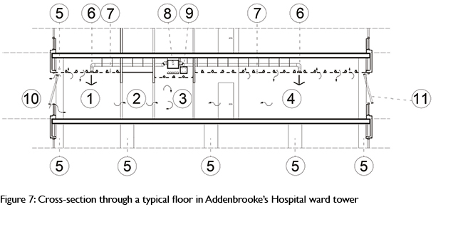 Addenbrooke’s Hospital ward tower is in Cambridge, in the east of England. It was built between 1967 and 1972 comprising a 10-storey slab block (Figure 6).11-13 An initial survey of NHS hospital sites by the authors identified at least 50 buildings of this basic type. The tower is 120m long on its southwest/northeast axis and variously 14.1m and 18.3m deep. All floors have the same overall geometry, a long central corridor to which, on the south side, multi-bed wards (10.2m deep from corridor to window wall) occupy the wider end parts of the building. Private rooms and offices face north. The occupied levels have a structural floor-to-ceiling height of 3.66m with, as designed, a 0.90m void above the suspended ceiling. Figure 7 shows a cross-section through a typical floor, showing the relative proportions of the single- and multi-bed spaces and also the relative height of the wards.