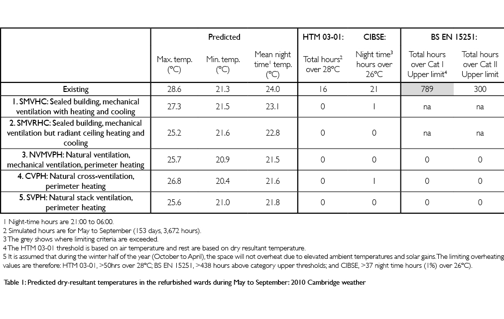 All five schemes dramatically improve performance, but these predictions do not include energy use for matters unconnected with space conditioning (small power, medical equipment, restaurants etc), which can be 44% of the total. Given this, it is likely that only Options 2 to 5 could plausibly meet the NHS energy target and CO2 emissions benchmark of 55–65GJ/100m3. Importantly this excludes Option 1, which has a mechanical supply of 6 AC/h as stated in HTM 03-01. Predictions of future performance used Test Resultant Year (TRY) and Design Summer Year (DSY) data for 2030, 2050 and 2080 supplied by the Prometheus project at Exeter University using the UKCP09 Weather Generator assuming the benign A1B scenario, which is now less credible due to the unexpectedly rapid rise in atmospheric carbon concentration. The existing building will ‘go off the rails’ by the 2030s. Table 2 shows that that Options 1 and 2 can eliminate overheating hours, but in the case of Option 1 this is done at a prodigious energy cost. Radiant cooling is much more effective. In extreme years, the hybrid Option 3 can maintain comfort to 2050 but clinical spaces are in difficulties by 2080. In standard TRY years, the natural ventilation Options 4 and 5 are remarkably robust but in extreme years performed well, as judged by the BS EN 15251 adaptive comfort method, in the 2030s but by the 2050s performance is unacceptable in Cat I spaces, the clinical spaces for the vulnerable, and by the 2080s also in Cat II spaces for less vulnerable patients. In these extreme years, the number of hours internal temperatures exceeded 28ªC was greater than exceeded externally, suggesting that passive night-time cooling will be less effective in future extreme years. The answer, then, is a naturally ventilated option with the capacity to install cooling in the future.