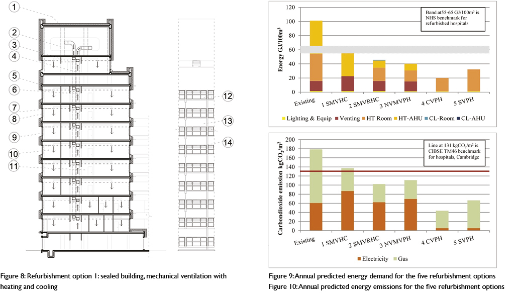Option 1: sealed building, mechanical ventilation with heating and cooling (SMVHC). This depicted in Figure 8. The external envelope is overclad to substantially improve air-tightness and U-values. The relatively recent thermal-break aluminium double glazing is retained to save cost. The ventilation system operates at 6 AC/h, as required by the Department of Health’s document Health Technical Memorandum (HTM) 03-01. Windows are sealed and a third layer of glazing added internally. The glazing is shielded by new interstitial blinds. Resilience to overheating is provided by increased mechanical ventilation with mechanical cooling for peak lopping when required. Modelling showed few summertime hours above the thresholds given in HTM 03-01 or those suggested by the Chartered Institution of Building Services Engineers (CIBSE): see Table 1. The annual predicted energy demands and emissions were 59GJ/100m3, so within the DH target, and 137kgCO2/m2 respectively (Figures 9 and 10). These figures exclude delivered energy, which would add to this figure. Relatively little energy was used for cooling but the ventilation energy demand to deliver the high airflows was significant.