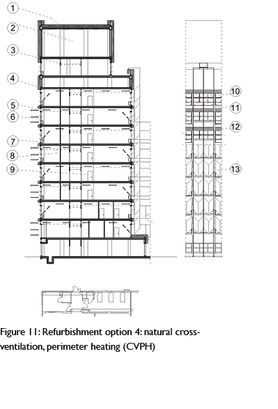 Option 4: natural cross-ventilation, perimeter heating (CVPH). This option (Figure 11) dispenses with the mechanical ventilation system altogether. It enables cross-ventilation by threading crossover ducts in alternating directions across the width of the floorplate and upgrades the external envelope to the standard of Options 2 and 3. Perimeter heating is provided with actuated trickle vents below fully operable occupant-controlled windows, adapting the existing installation. Effective night ventilation will be important. All suspended ceilings are removed to expose the full flat concrete soffit above all patients so that vigorous night ventilation will cool the soffits. In this entirely naturally driven scheme there were no predicted summertime hours above each of the thresholds (Table 1) and the annual predicted energy demands and emissions were just 20GJ/100m3 and 44kgCO2/m2 respectively (Figures 9 and 10), the omission of fans being the key to such low energy demand.