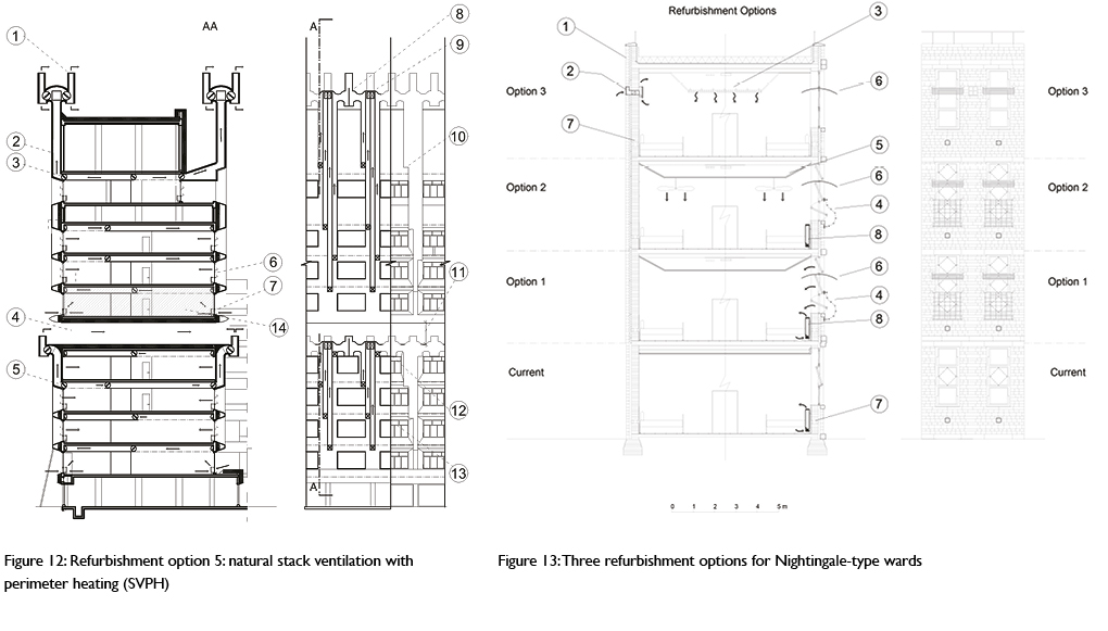 Three incremental refurbishment options were devised for the Nightingale wards (Figure 13). The first adds 100mm of insulation to the walls and 300mm to the roof; opens up the triple-light windows and protects occupants with an architectural external steel grillage; and provides a sunshade at each opening. Fresh air supply in winter is provided by the reopening of a trickle vent behind a perimeter heating element. The second option adds ceiling fans operable by the patients to this strategy, while the third option introduces 100mm-diameter high-level air inlets above each bed space, between each window, with a damper, and a simple convective heating device fixed to the internal face to enable supply air to be pre-heated and/or recirculation within the space. Primary heating and cooling is delivered through the installation of radiant panels. The addition of radiant cooling eliminates entirely the risk of overheating. The further adaptation work reported here takes the second option as the base treatment of the envelope.