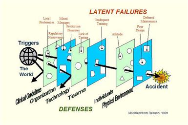 Reason’s theory of human errors Reason, in his work Human Error8, teaches that accidents are latent in systems. This idea speaks to the imperfection of the design of systems as much as to the fallibility of the people who operate them. Reason describes a system as having a series of layers of defence (Figure 5).