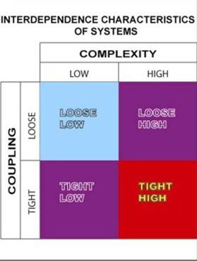 The steps of making a sandwich are loosely coupled. The steps in flying off the carrier are tightly coupled. Healthcare, for example, is a system that is highly complex and tightly interrelated, with many subcomponents, and some hidden characteristics, requiring ‘operators’ to use a great deal of short-term memory or computing power.